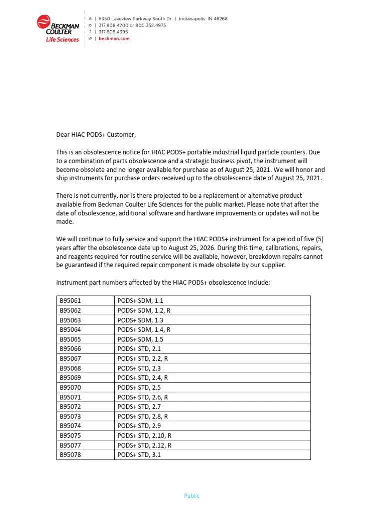 To read Beckman Coulter’s official obsolescence notice for the HIAC PODS unit, click here.