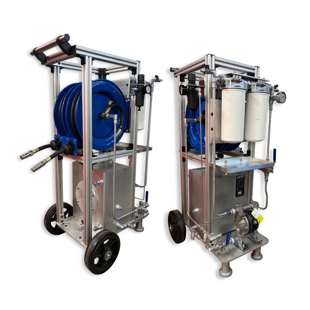 PFPUSA’s custom mobile filter carts for rent can handle most flow rates that are required in most industrial applications, as low at 0.5 GPM all the way to higher flow rates (such as 5 GPM, 11 GPM, and 22 GPM). We offer a large variety of materials and types of construction, including stainless steel and explosion-proof options!