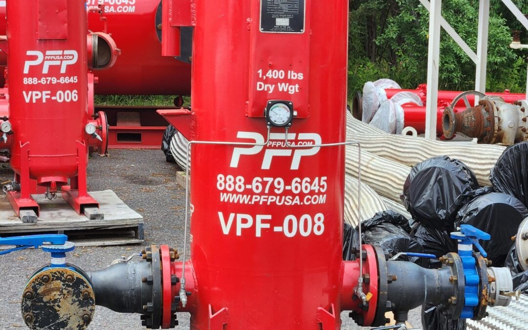 Pictured is a vertical particulate pre-filter (VPF) vessel located at the Precision Filtration Products rental storage facility. As part of PFP’s extensive rental fleet, this unit is prepared for rapid deployment to terminals, refineries, or field service locations where first-stage filtration is required. The VPF removes suspended solids from fuels and process fluids, extending the life of downstream coalescers and polishing filters.
